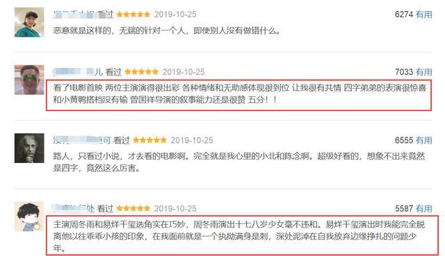 有观众赞不绝口地说:两位主演演得很出彩,各种情绪和无助感体现很到位,让我很有共情,四字弟弟的表演很惊喜,和小黄鸭搭档没有输,曾国祥导演的叙事能力还是很赞。主演周冬雨和易烊千玺选角实在巧妙,周冬雨演出十七八岁少女毫不违和。