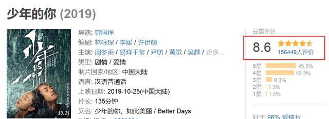 上映两天,票房已经达到了3.77亿,可谓势如破竹。豆瓣评分高达8.6分,非常出色的《哪吒之魔童降世》最高分一度达到8.9分,后来下降到8.5分。而《少年的你》有近16万人打分,分数仍然高达8.6分,可谓是口碑的发酵,让大家对这部电影称赞连连。