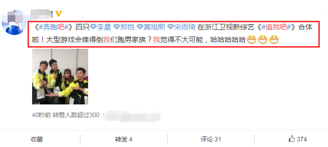 与跑男一样都是浙江卫视,又以奔跑家族亮相,这两件事联系在一起看的话,网上关于跑男团新一季将要大换血的传闻,就真的是纯属无稽之谈了,不然李晨郑恺等人,想来就不会用奔跑家族的身份亮相了。
