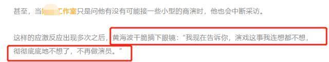 在采访中,黄海波还表示自己已经完全断了做演员的念头,想都不会再想了,不做演员了。原因之一就是复出之路太过艰难,比如在《长安十二时辰》中明明出演,却不能署名,而且最后还遭到了AI换脸。