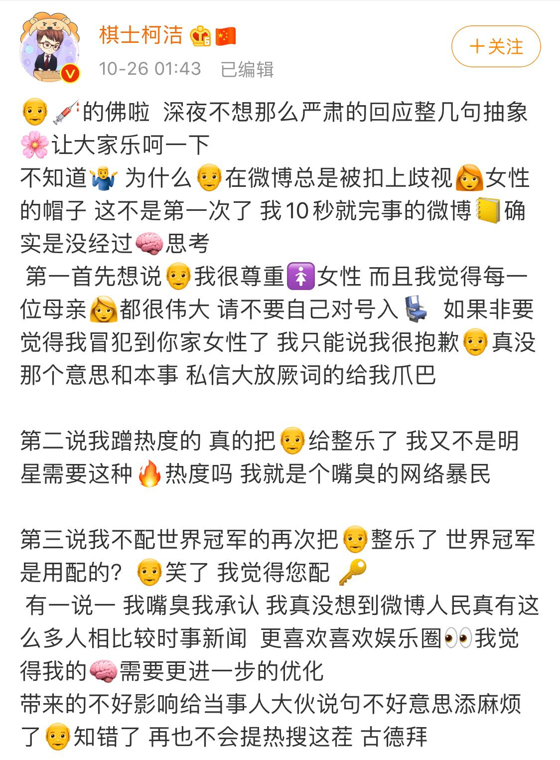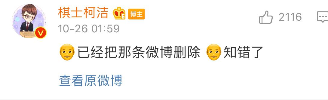 对此,柯洁正式发文认怂道歉,并删除了那条微博。