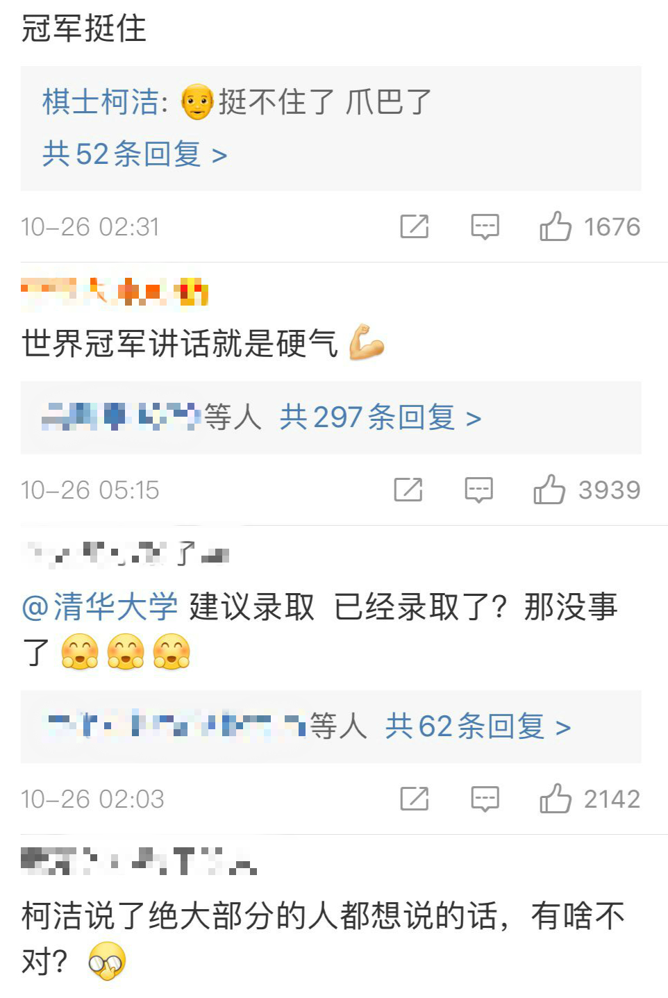 也有网友喊话柯洁挺住,而柯洁则表示“挺不住了”。