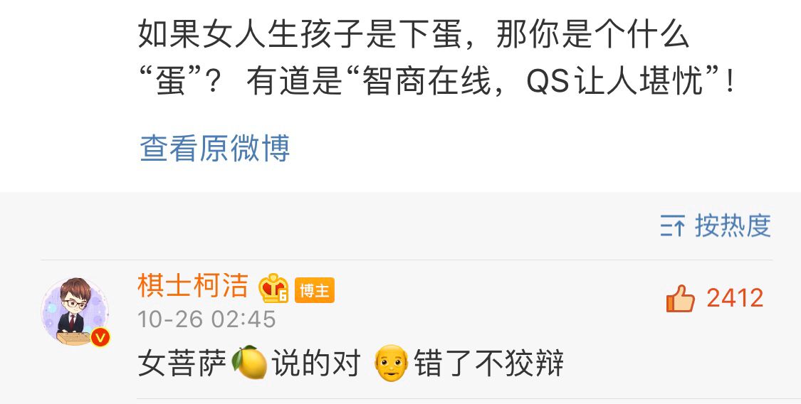 有网友怒批柯洁歧视女性,这位网友这样写道:如果女人生孩子是下蛋,那你是个什么“蛋”?有道是“智商在线,QS让人堪忧”。