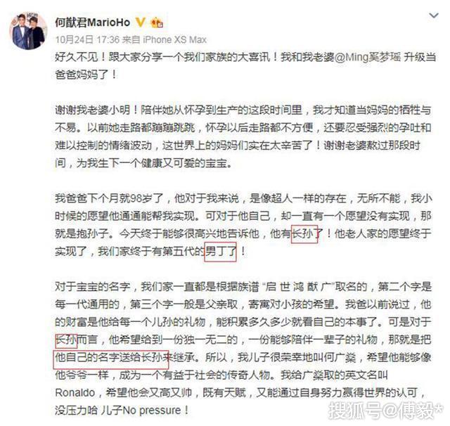因为在他的长文中多次提到"长孙"、"男丁"字眼,让不少网友都觉得这是返祖了,现在还要强调这样的概念,实在是太low了。本来何猷君宣布喜讯也是非常正常的事情,但是他却一定要强调这个孩子的性别、身份,还要强调他的爸爸有多么在乎这个长孙,被不少网友吐槽这么高学历的人能写出这么"封建"思想的话来,实在是令人反感。