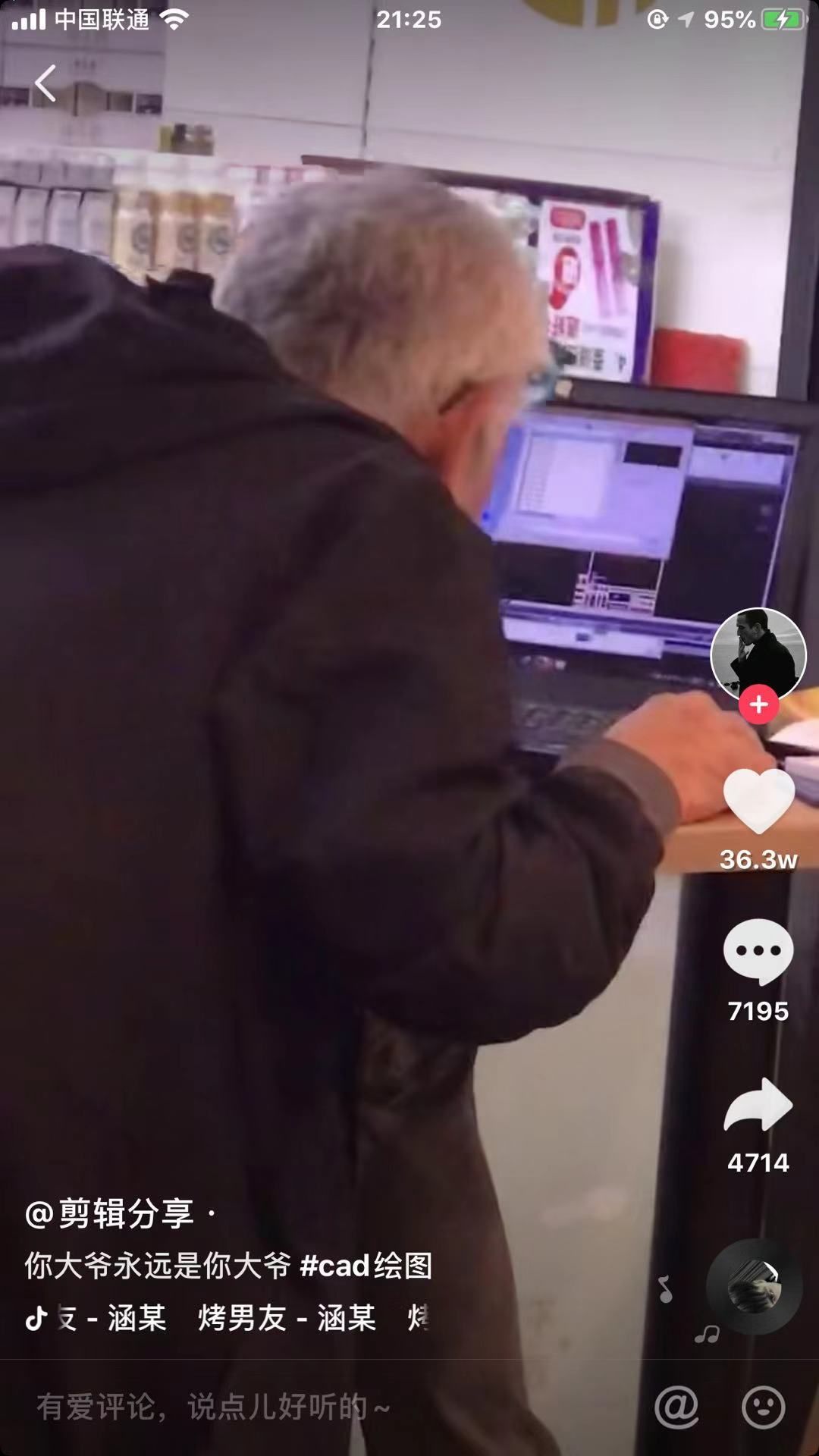 昨天晚上我刷某个APP的时候,刚好还刷到了一个头发花白的老大爷在超市门口做CAD的视频。