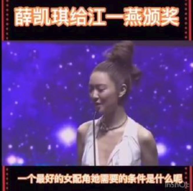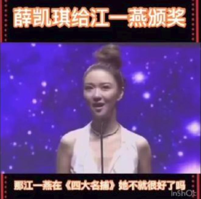 薛凯琪自然有些怀恨在心,后来好巧不巧,有一次颁奖典礼,颁奖嘉宾是余文乐和薛凯琪,得奖的女配角是江一燕,薛凯琪终于逮到了机会,上来就问余文乐:一个最好的女配角需要的条件是什么呢?