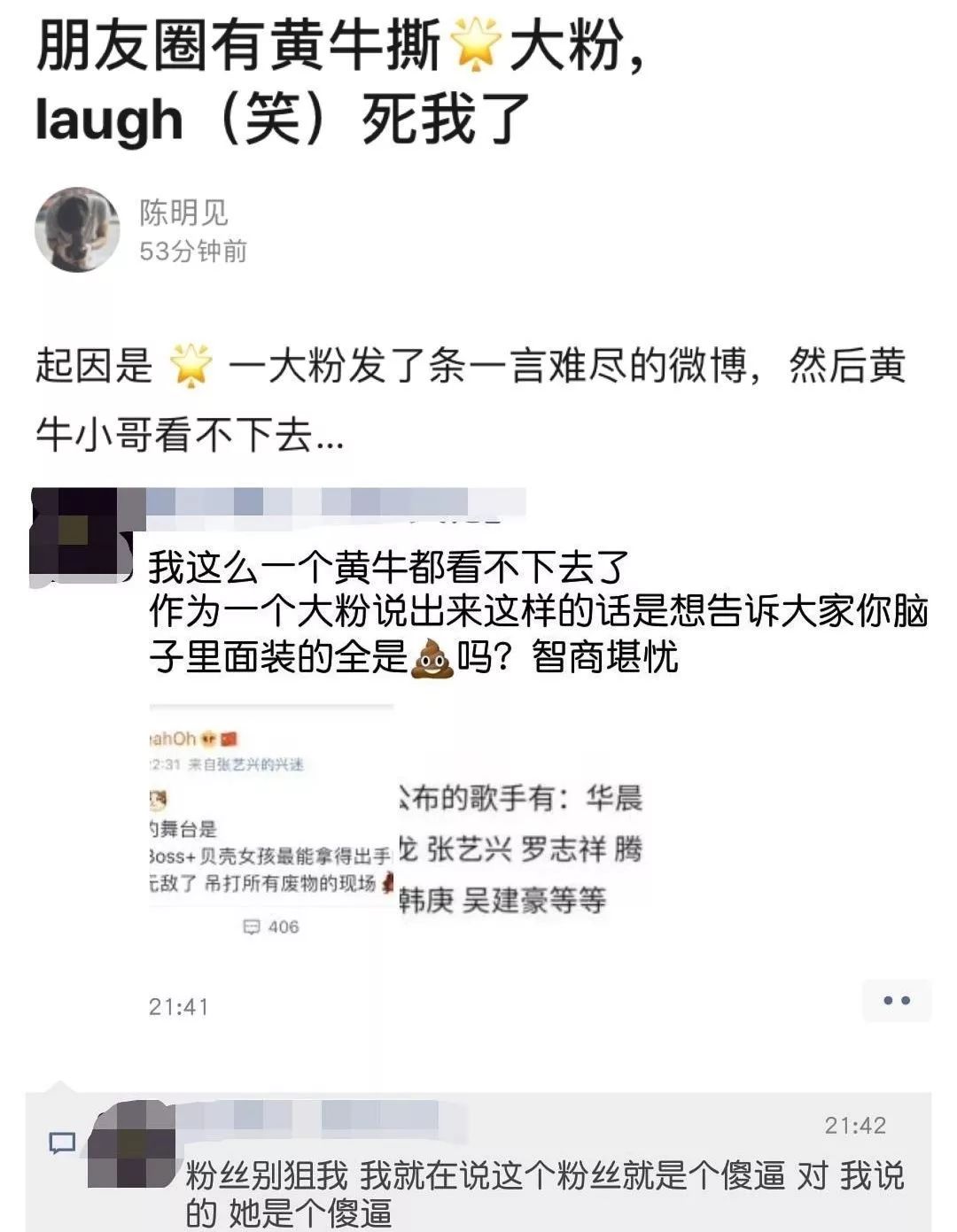 随后就有张艺兴家的粉丝要求黄牛删掉朋友圈,黄牛回复到,只怼脑残粉丝,不针对爱豆本人。