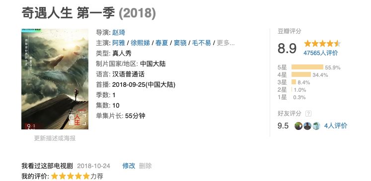 《奇遇人生》第一季评分高达8.9分。