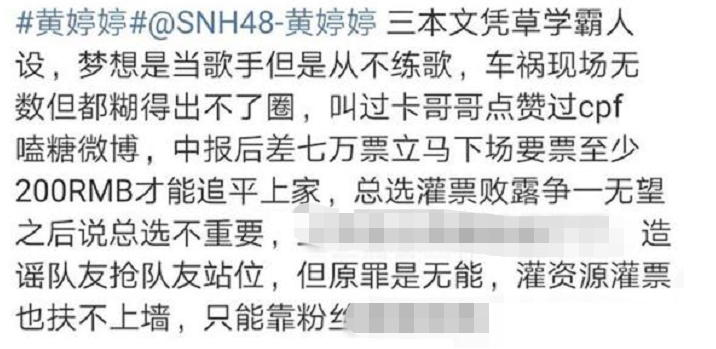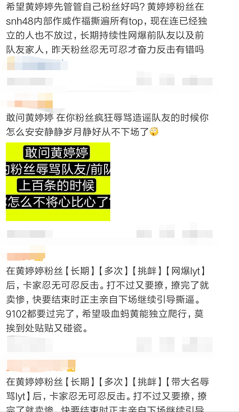 黄婷婷亲自辟谣后,许多网友纷纷前来攻击她,多是另一位女星李艺彤的粉丝,双方粉丝更是开启疯狂的互撕模式。不少网友对黄婷婷进行谩骂,指责她的粉丝四处网曝SNH48前队友,甚至是队友家人,认为黄婷婷粉丝的行为太无耻了。