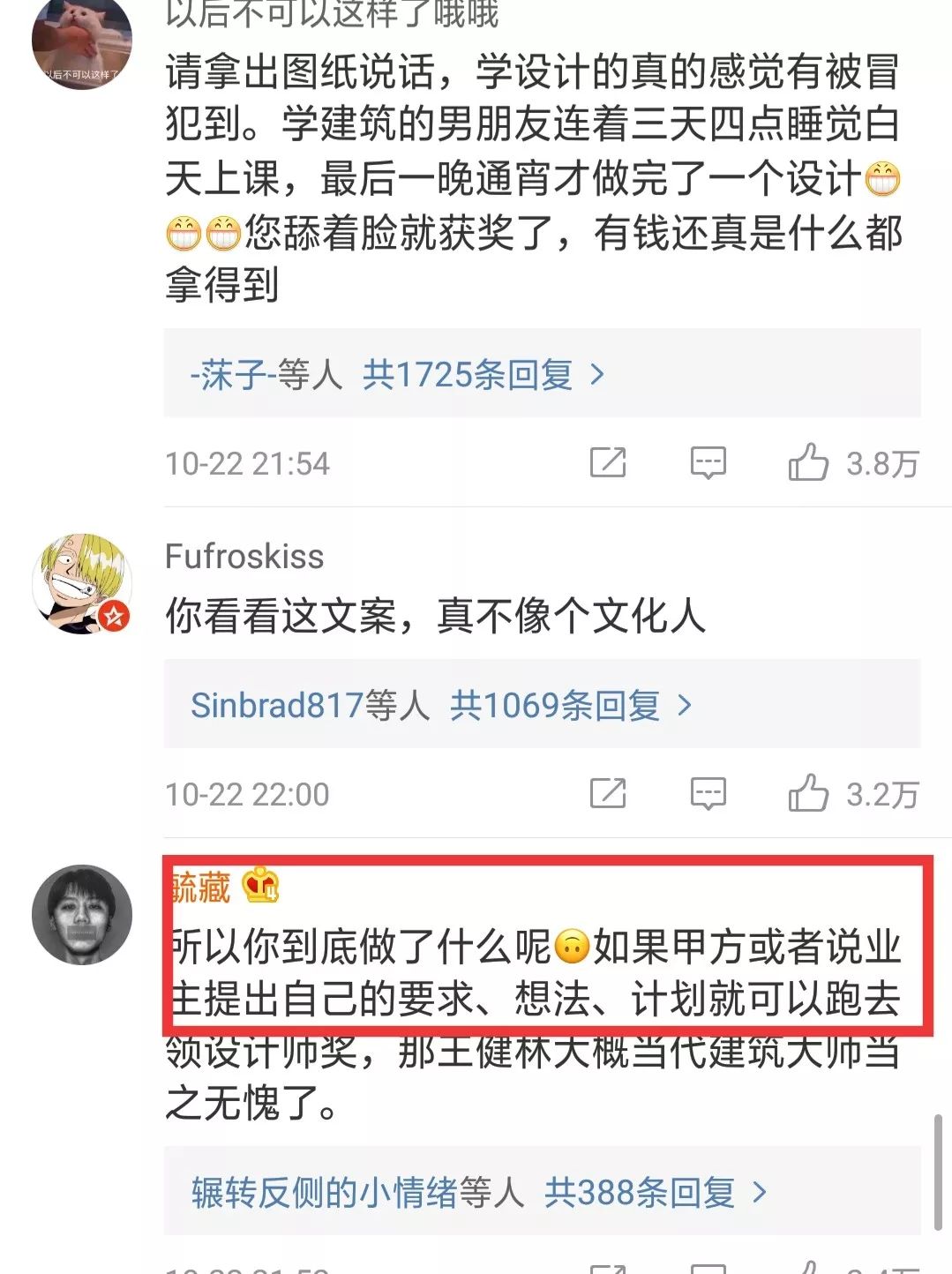 其实作为该奖有专业人士表示可以有甲方出面领奖,但在其他建筑大奖里似乎没有甲方出面领奖的先例,这个奖不乏有点水,在媒体通稿里不发设计团队的名字着实是对设计师的不尊重。