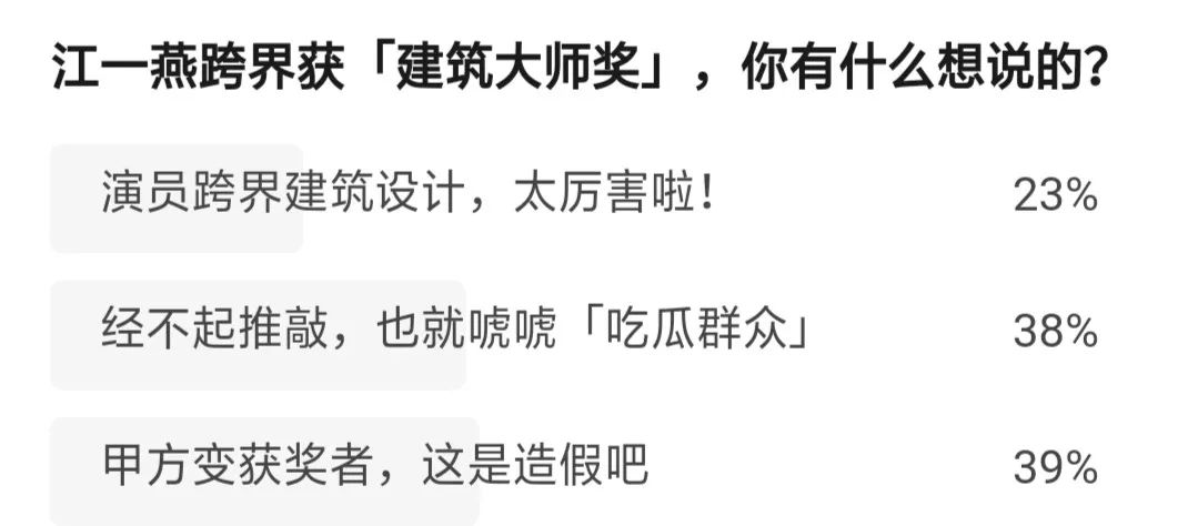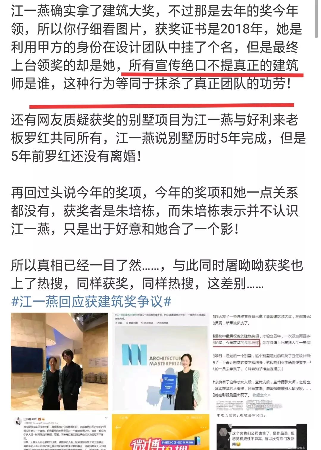 事情一开始江一燕获建筑奖消息标榜热搜第一,不少网友前来围观,网友感叹原来女神还有这种隐藏技能,随着热度的攀升消息散播的越来越广引来不少专业人士的质疑,风向极速转变称“江一燕蹭奖”,获奖人根本不是她,江一燕顶多算是甲方,第一次见甲方代替设计师领奖理直气壮引起许多专业设计师的不满。