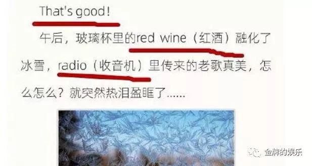 在江一燕的文章中,小编给大家例举一个句子:"午后,玻璃杯里的red wine融化了冰雪,radio里传来的老歌真美,怎么怎么?就突然热泪盈眶了……"网友们更是纷纷在评论下尽情发挥了自己的"沙雕"潜质,其中一位网友所评论的"我真的有被shock到",还有"我think很perfect"等,让不少吃瓜群众爆笑出声。