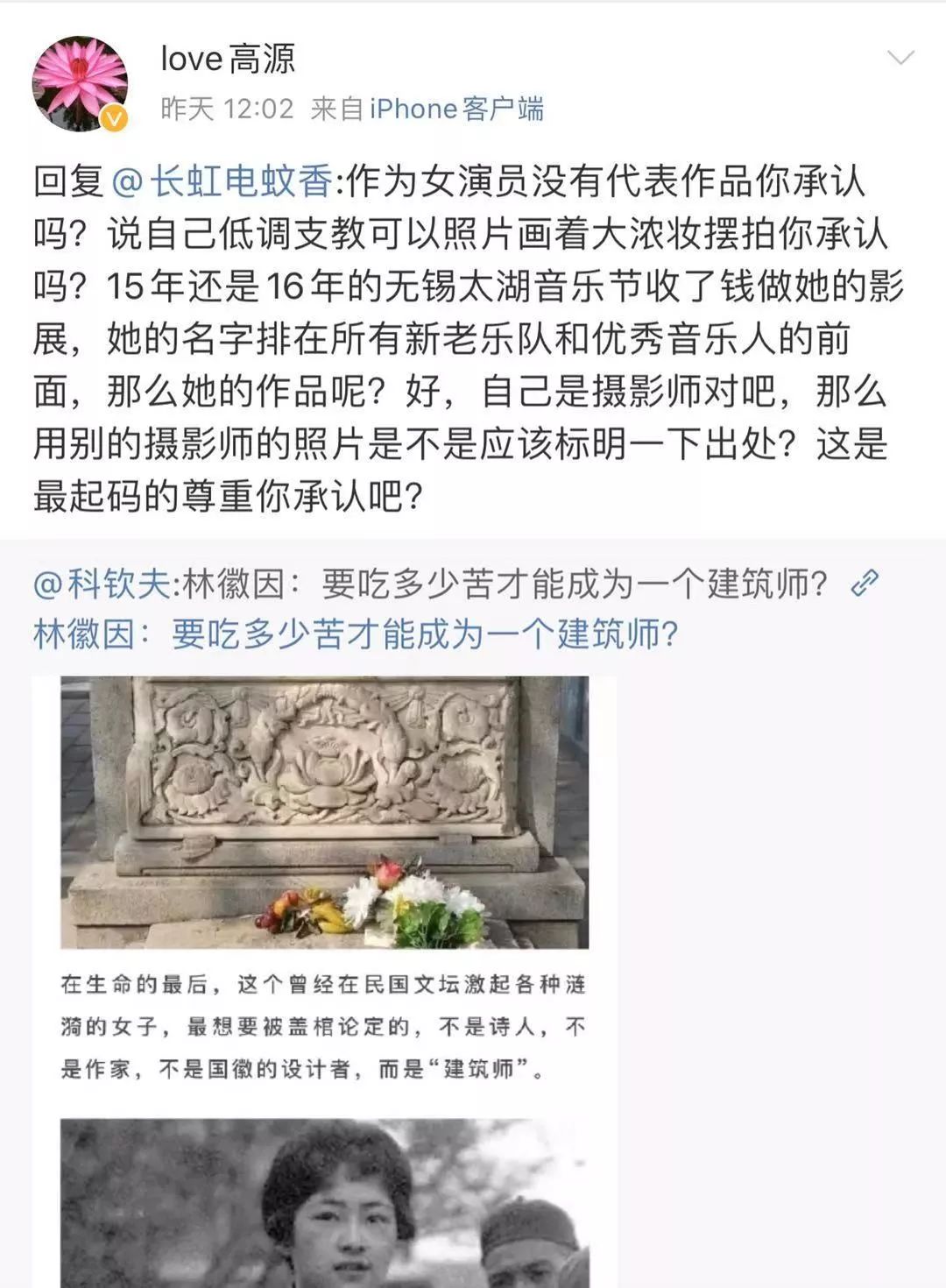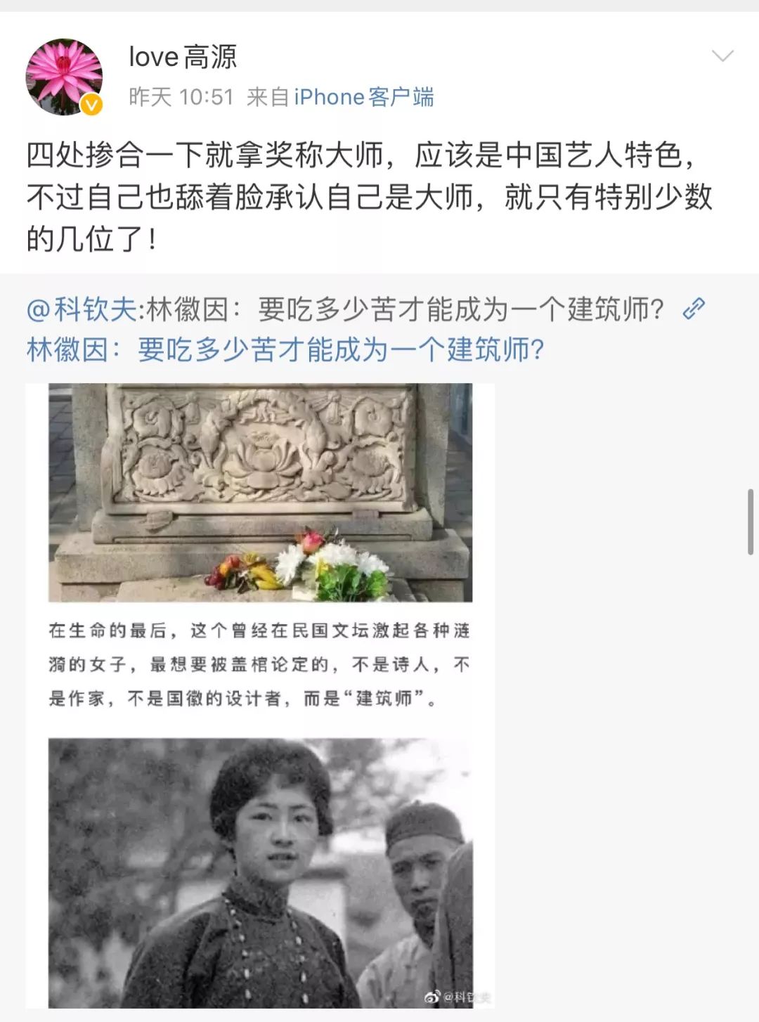 她先是转发了一篇名为:“林徽因:要吃多少苦才能成为一名建筑师?”的文章,然后写道:“四处掺合一下就拿奖称大师,应该是中国艺人特色,不过自己也舔着脸承认自己是大师,就只有特别少数的几位了!”高源这番话,再结合她转发的文章,明眼人都能看出来,她说的江一燕。
