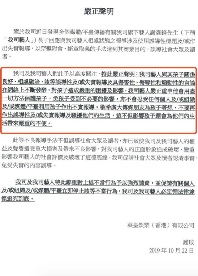 后来英皇娱乐发声明称是谣言,表示谢霆锋与孩子关系相处融洽,误导性报道极具伤害性,对孩子造成严重的困扰和影响。