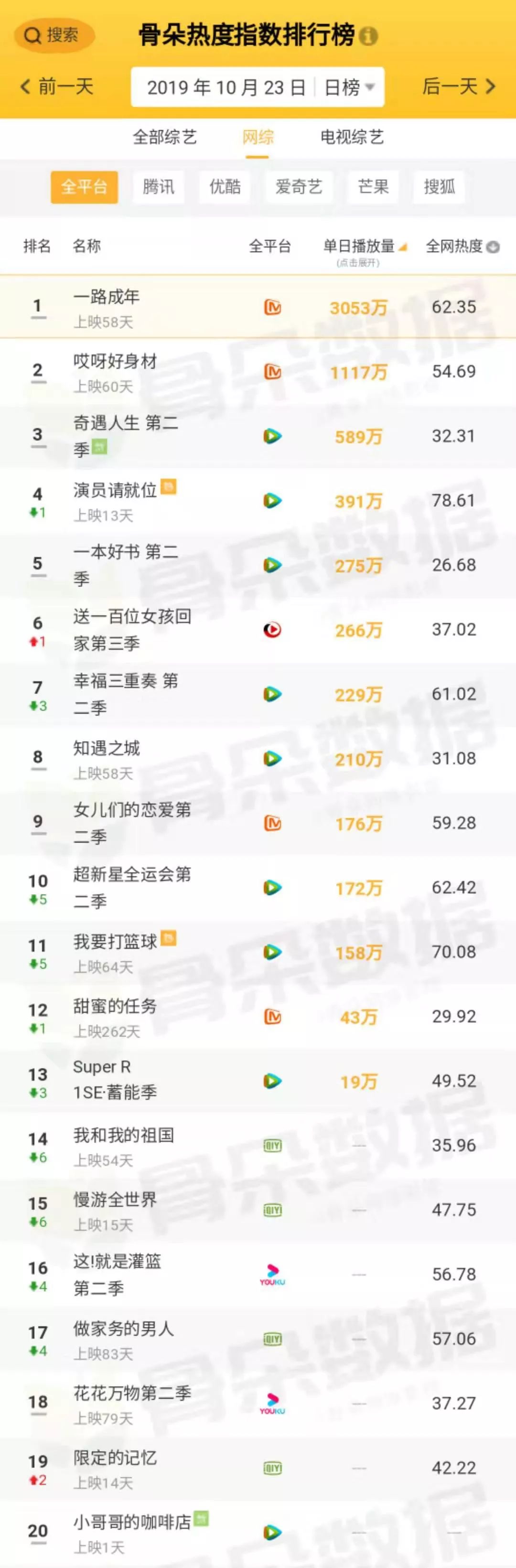 原标题:骨朵榜单丨2019年10月23日网络影视播放量及指数
