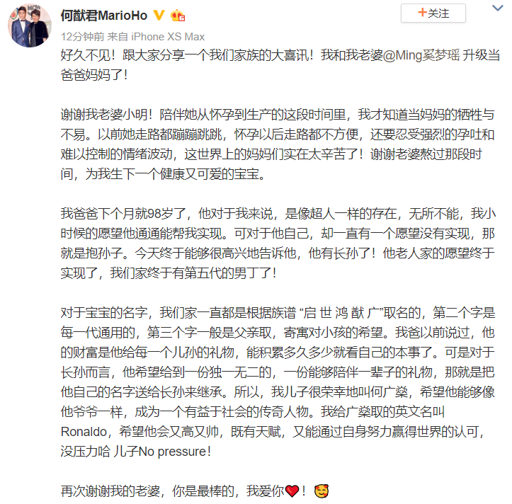 长文中,何猷君公布了孩子的名字“何广燊”,英文名叫“Ronaldo”,而宝宝的名字则是根据族谱“启 世 鸿 猷 广”取名的,而由于赌王何鸿燊之前就表示希望把他自己的名字送给长孙来继承,由此,按照族谱中的广字辈加上赌王的“燊”,从而为其取名何广燊啦,这么一看,还真是太有来头啊。