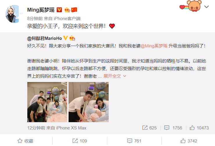 刚刚!赌王之子何猷君在微博上发长文宣布妻子奚梦瑶生子喜讯,随后,奚梦瑶也转发何猷君微博并表示:“亲爱的小王子,欢迎来到这个世界!”