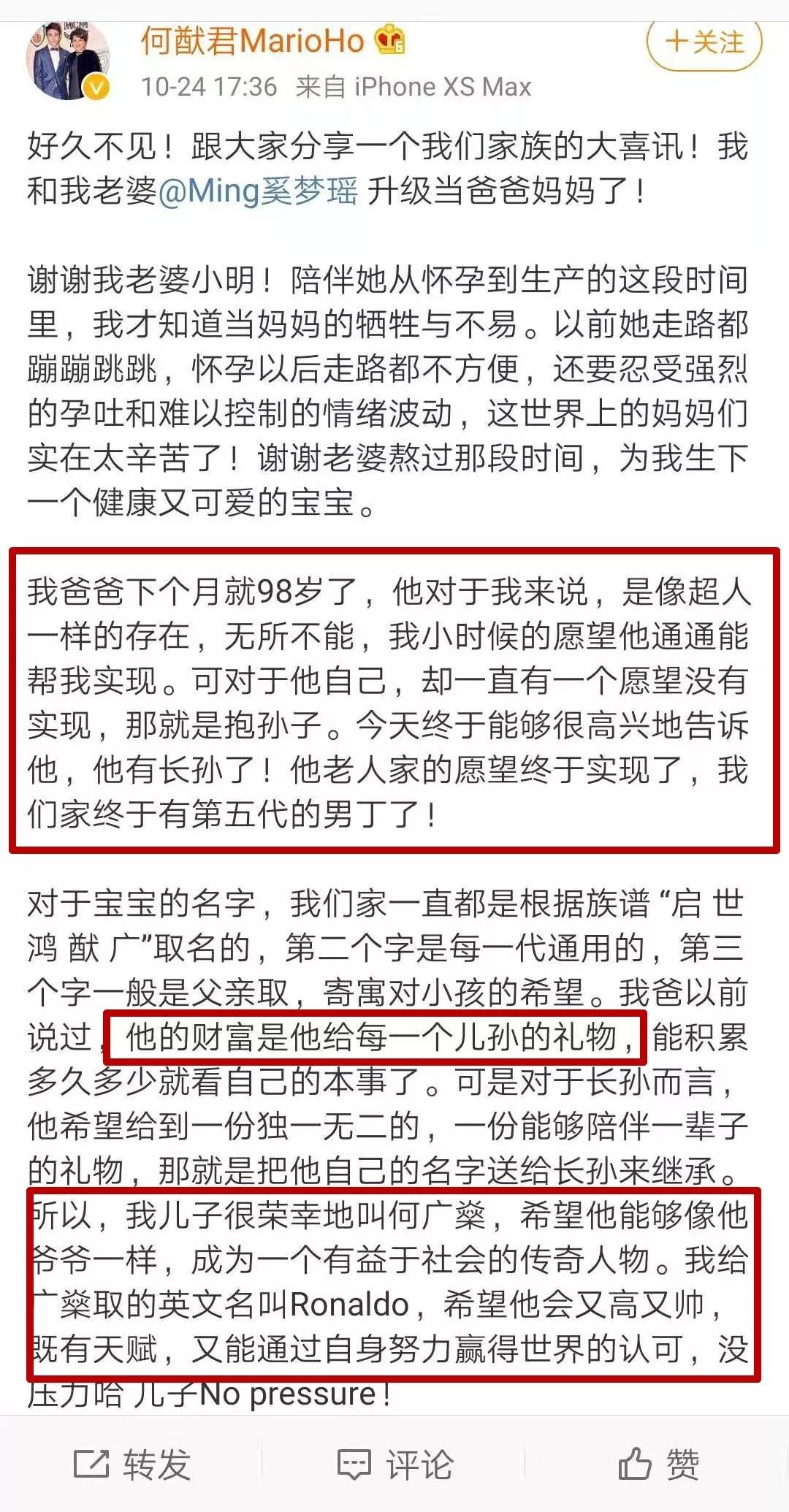 10月24日,名模奚梦瑶终于为98岁赌王生下了长孙,从何猷君发布的喜讯来看,大家能感受到他的激动,除了有初为人父的喜悦外,他文章中的信息量也比较引人“好奇”。