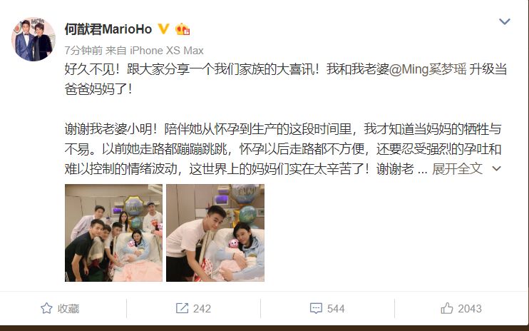 原标题:恭喜!何猷君发文宣布奚梦瑶产子的喜讯,98岁赌王终于迎来