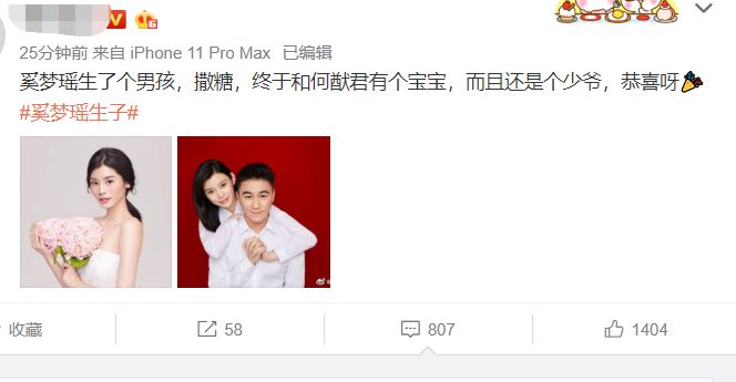 10月24日,以为娱乐大V在网上爆料,称奚梦瑶已经生了孩子了,而且还是个男孩,看到这个消息后网友也纷纷送上自己的祝福,不得不说在五月份求婚成功,十月份就生下孩子这速度还是挺快的。
