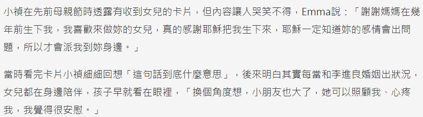 女儿Emma其实也是小祯没有和李进良彻底切断关系的最重要原因,可就算百般维护,女儿还是心知肚明,在母亲节卡片上力挺小祯,“谢谢妈妈在几年前生下我,我喜欢做你的女儿,真的感谢耶稣把我生下来,耶稣一定知道你的感情会出问题,所以才会派我到你身边。”