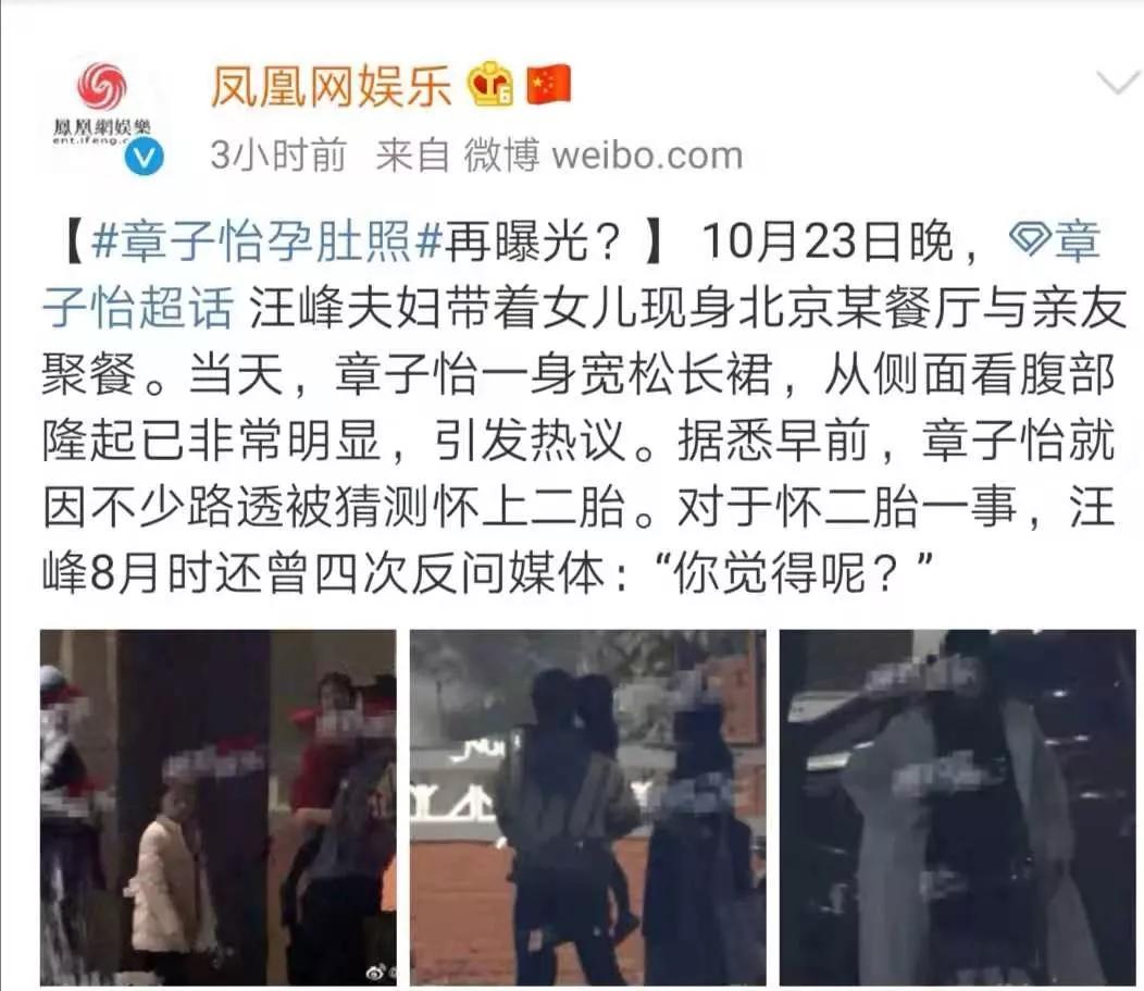 10月23日晚,有媒体拍到了汪峰章子怡一家三口与亲友聚餐的照片,从照片来看,当天的汪峰和章子怡打扮得都很低调,汪峰抱着女儿,而旁边的妻子章子怡身穿深色长裙,仔细看会发现章子怡的腹部隆起非常明显,疑似再次验证了她已怀二胎的传闻。