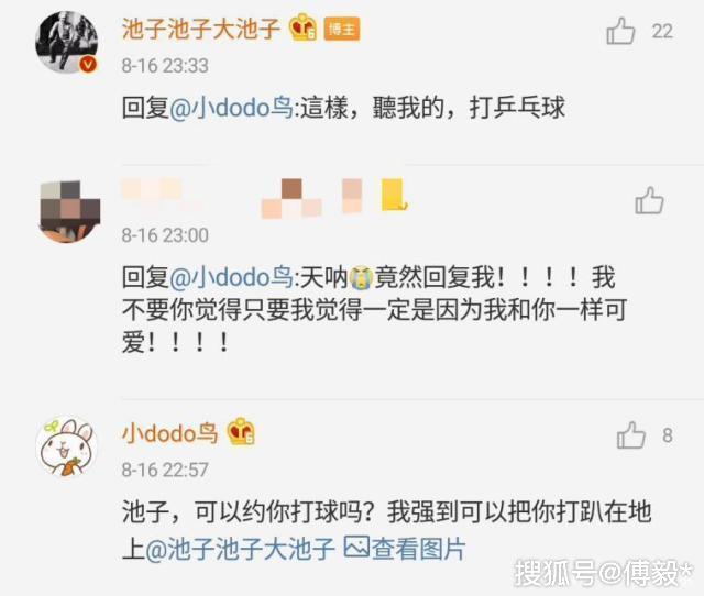 今年八月中旬,豆得儿在微博上约池子打羽毛球,池子的应允令她倍感欣喜。而从豆得儿的微博日常看,她对有幽默感的男生没有抵抗力,而池子便是她心中中意的那款。豆得儿在微博上多次发表莫名感慨,其指向也是直指池子,毫不虚掩。