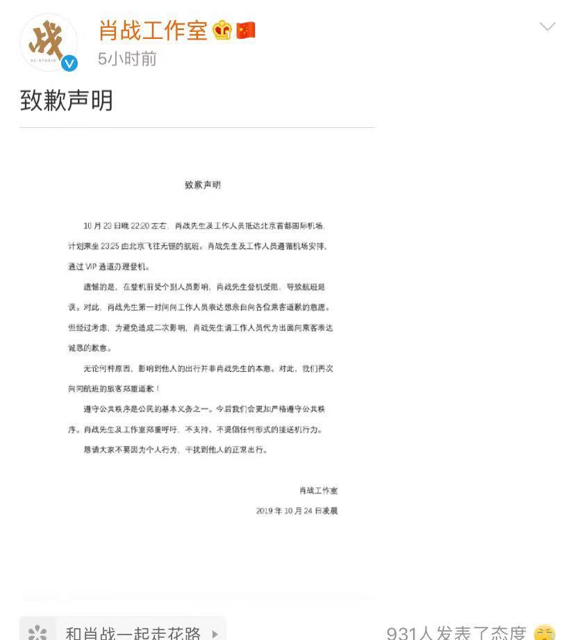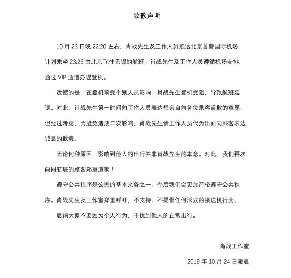 登记前受个别人影响,肖战登记受阻,导致航班延误。对此,肖战第一时间向工作人员表达想亲自向各位乘客道歉的意思。但经过考虑,为避免造成第二次影响,肖战请工作人员代为出面向乘客表达诚恳的歉意。肖战及工作人员郑重呼吁,不支持,不提倡任何形式的接送机行为。恳请大家不要因为个人行为,干扰到他人的正常出行。