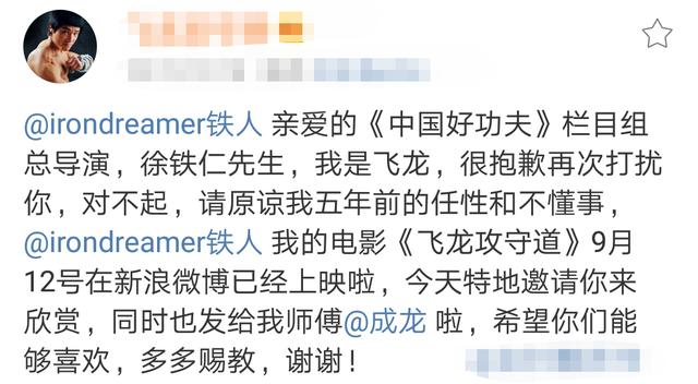 飞龙首先通过社交平台圈中了《中国好功夫》栏目总导演徐铁仁的账号,他写到:“亲爱的《中国好功夫》栏目组总导演,徐铁仁先生,我是飞龙,很抱歉再次打扰你,对不起,请原谅我五年前的任性和不懂事,我的电影《飞龙攻守道》9月12号在微博已经上映啦,今天特地邀请你来欣赏,同时也发给我师傅成龙 啦,希望你们能够喜欢,多多赐教,谢谢!”