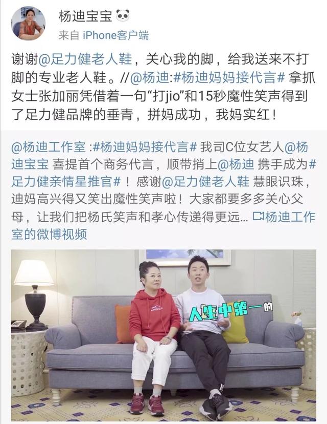 其实足力健老人鞋一直以来都倡导“关爱老人、珍惜老人、让老人有个更欢乐的老年生活”,而杨迪在微博上晒出的和妈妈的欢乐互动恰好和一点非常契合,这才邀请母子俩担任足力健老人鞋“亲情星推官”。