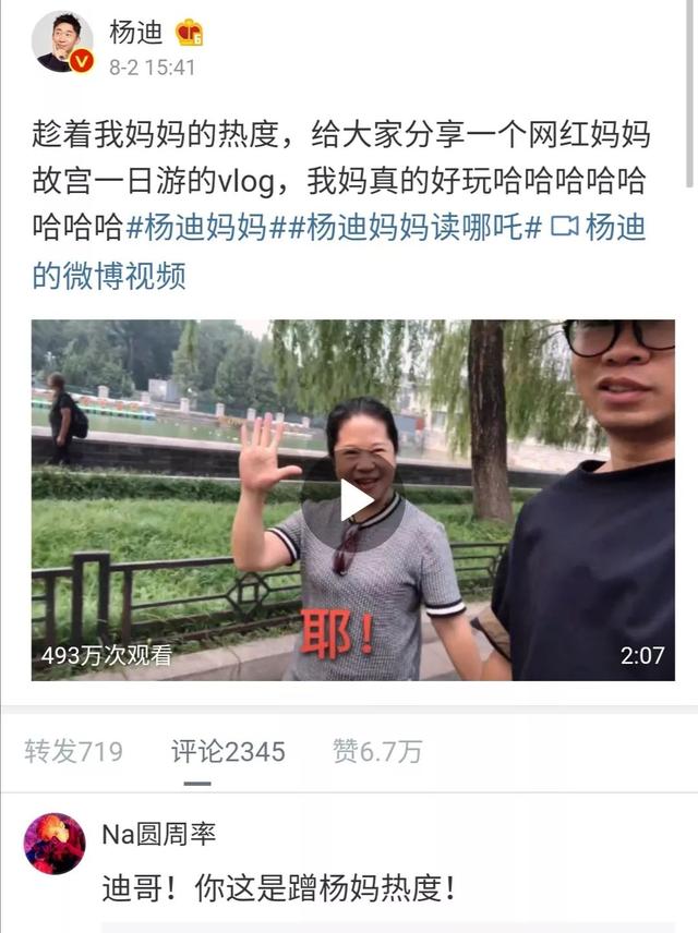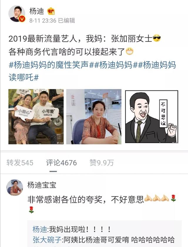 杨迪还坦然承认妈妈的人气,公开在微博为妈妈开了个广告位“招商”。