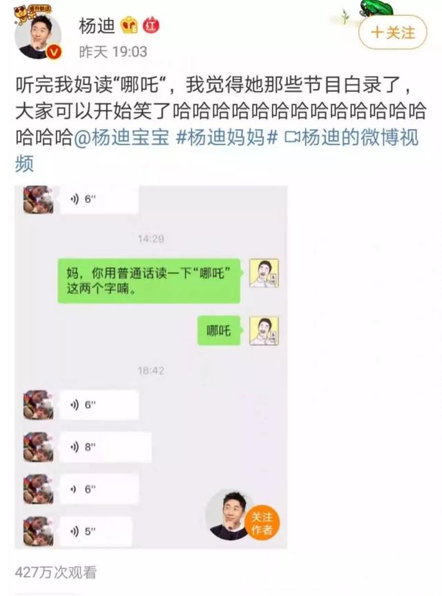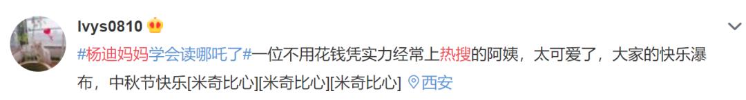 后来杨迪妈妈还在中秋节的时候又发了一个视频,给大家带来了一句改良版的“勒杂”来汇报普通话哪吒的学习成果,一下子#杨迪妈妈学会读哪吒了# 这一话题又上了热搜。
