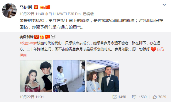 10月22日,保剑锋在个人社交网站上晒出一组和马伊琍20年前的合照。校园时期的马伊琍留着一头乌黑的长发,身穿一身红色洋装,手搭在保剑锋胳膊上,一旁的保剑锋身穿白衬衣黑马甲,目光紧紧盯着女伴,两人的造型优雅贵气,复古年代感十足。