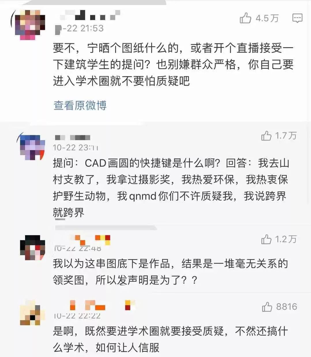 看了江一燕的长微博之后,不少网友都说这波回应是负分。因为江一燕一开始就说自己做公益啊,做展览之类的,但就是闭口不提建筑奖的事儿,图片也是晒的领奖图,并没有晒出什么设计图纸之类的,让人难以信服。