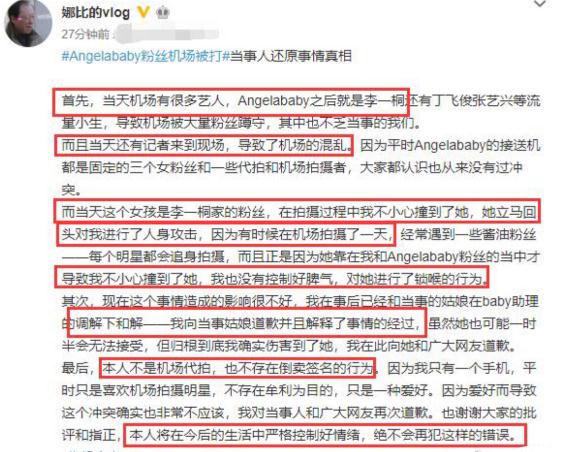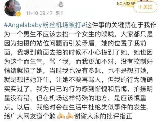 angelababy粉丝机场被打的话题登上微博之后,起初baby的粉丝自然相当气愤,他们一致将枪口对准了那位打人的男子,但是让人万万没想到的是,之后这起打人事件竟然发生了一次大逆转,11月10日中午,那位在机场打人的男子在社交平台上发文,正式回应了此事。