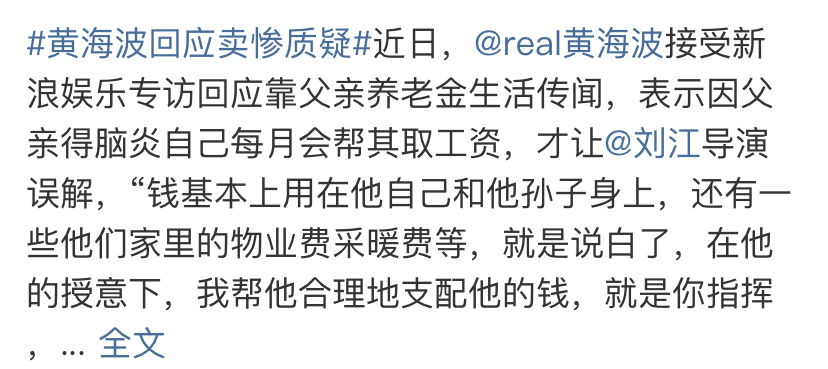 网友在听到这一消息后都纷纷心疼他,觉得这样的男明星很惨。而10月22日,黄海波在接受专访时也正面回应,“并没有穷的揭不开锅,父亲因为患病不方便,所以替他取工资,事实并不像导演刘江说的那样”。