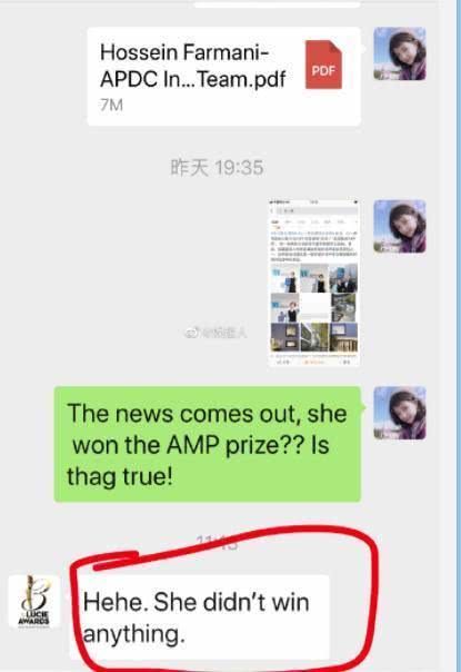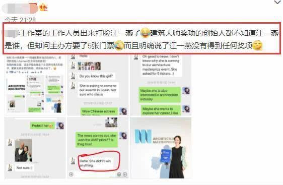 有网友注意到了江一燕获奖的颁奖图,她拿的奖项居然是2018年的,而且关于2019年这个奖项的获得者是一位建筑师。有知情人士曝光了获奖者的朋友圈称根本不认识江一燕,她只是过来与自己合个影,只是来观摩这个活动。