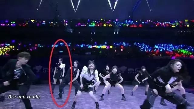 其他队友都在卖力表演,而她显然动作不熟,慢半拍,动作敷衍,连腰都懒得弯,似乎在学习。