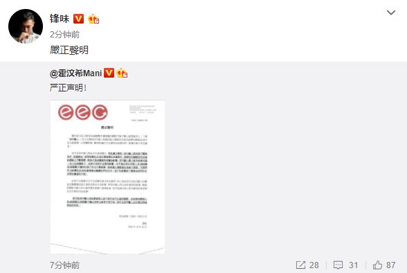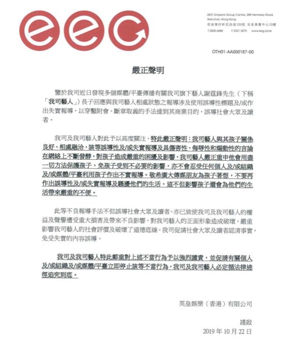 22日霍汶希在社交平台上发布了声明,称个别媒体断章取义做出不实报道,夸大社会舆论对孩子造成困扰。谢霆锋与孩子之间相处非常融洽,谴责了有关媒体的不实报道,表示要追究到底。谢霆锋本人对此也进行了转发表明了自己的态度,父子间并没有网络传闻上的矛盾。