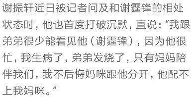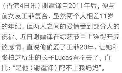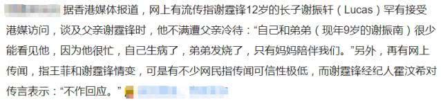 在这篇港媒报道中还称是因为近日谢霆锋在某个综艺节目中谈及感情说自己偷偷爱了王菲20年引起了Lucas的不满,这番言论自然引起了网友们的热议,认为谢霆锋未免太过薄情,对于儿子的成长有些不管不顾。