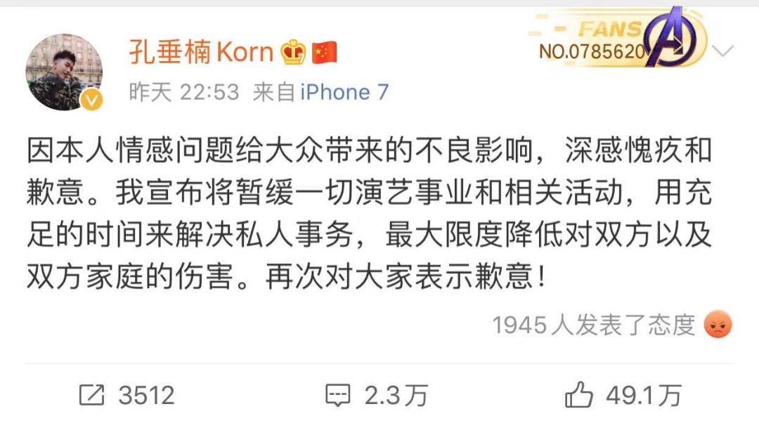 张孟妍的微博曝光之后,孔垂楠的工作室快速发布声明,称一切都是女方臆想。但不巧的是,在工作室发声明的3分钟前,张孟妍放出了语音证据,锤相当硬。于是孔垂楠本人只好半夜发文,称自己会暂缓演艺事业,语气官方。本以为事情到这里就不了了之了,毕竟孔垂楠是做好了躺尸一段时间的准备,但万万没想到,事情又有反转!
