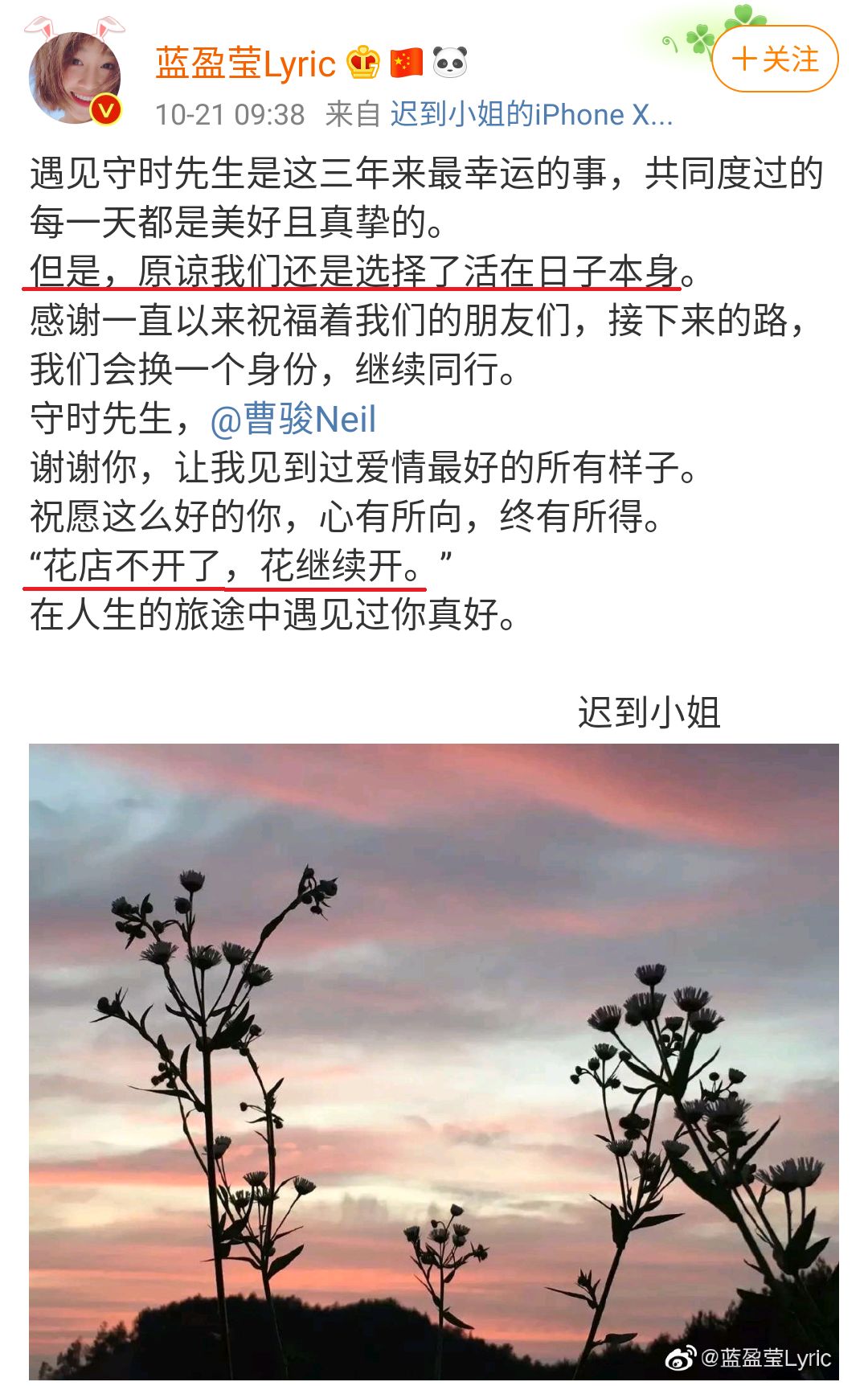 再来看蓝盈莹的声明,这句“花店不开了,花继续开”,堪称分手声明范本了吧!