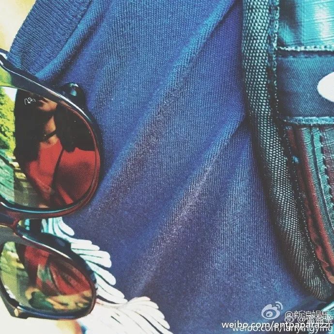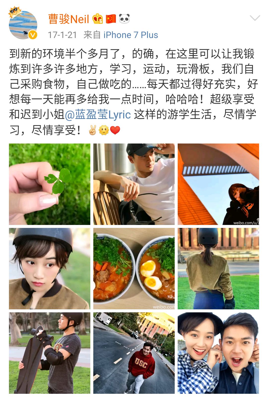 2016年6月底,蓝盈莹在旅游时曾Po出一穿蓝色T恤的男生,而曹骏微博照片里穿的正是那件T恤。