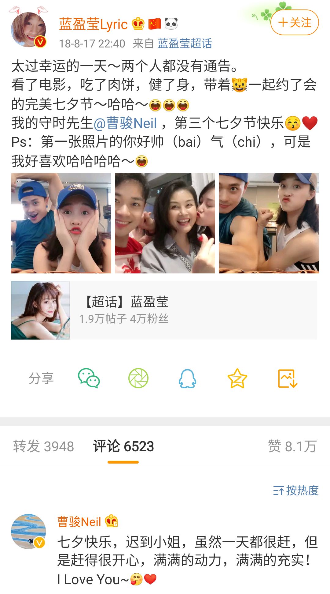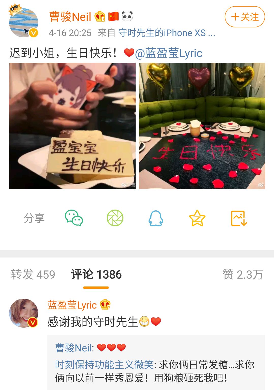 不管工作还是生活,他们一直都很合拍,本以为他们会一直这么幸福下去,直到今年事情却好像悄悄起了变化。两人在微博的互动变得越来越少,除了今年蓝盈莹生日的时候,曹骏发了一条为她庆生的微博。