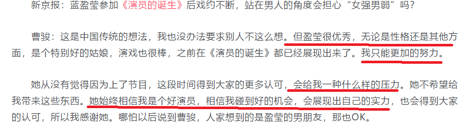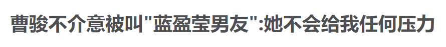 对于曹骏来说,蓝盈莹是伴侣,更是知心挚友,即便女友比自己名气大,他也不觉得自己会有压力,希望自己有机会展现能力。