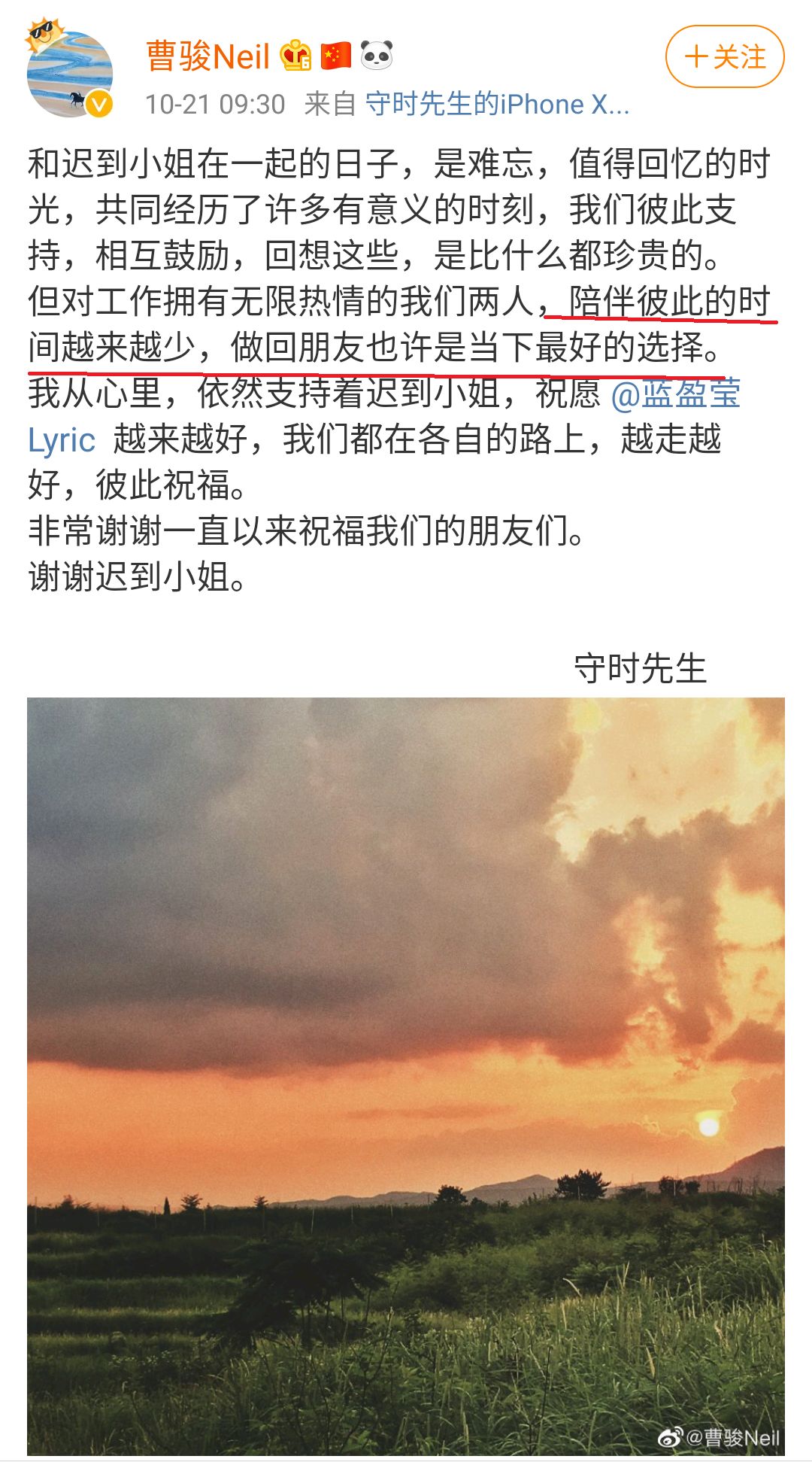 这两位前情侣保持了谈恋爱以来的统一风格,连分手文案都写得很温柔,还是以“迟到小姐”和“准时先生”称呼彼此。