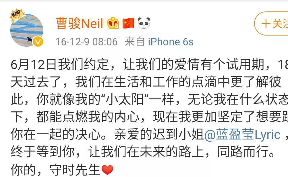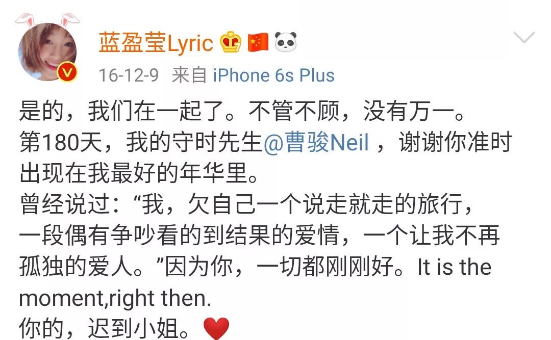从恋爱起步到结束,蓝盈莹和曹俊在爱情的每个阶段都称得上是圆满,爱得痛痛快快,分得客客气气,即便是今天的分手宣言,读起来依然铿锵有力,激情饱满,有人说这是分手教科书,兽兽说这是正能量分手,看不到哀伤,也看不到埋怨,这个句号画得很体面。