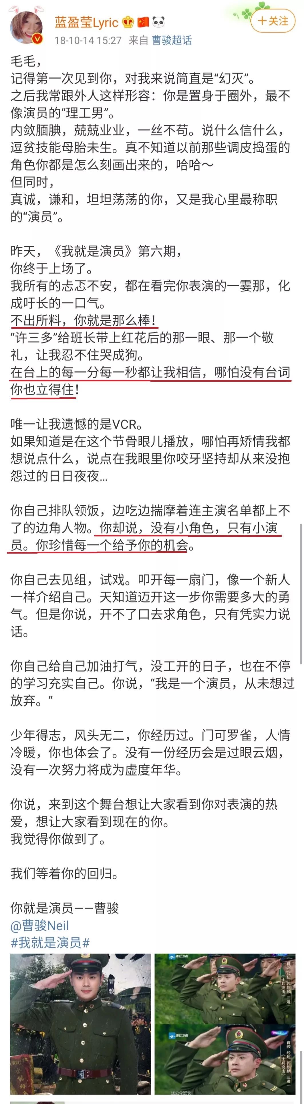 曹骏参加我就是演员,饰演许三多,导师章子怡也动情落泪,不过他还是遗憾遭到淘汰。面对曹骏在演艺事业上的挫败,蓝盈莹给他写了篇长长的小论文,力挺他,直夸“你就是这么棒”!