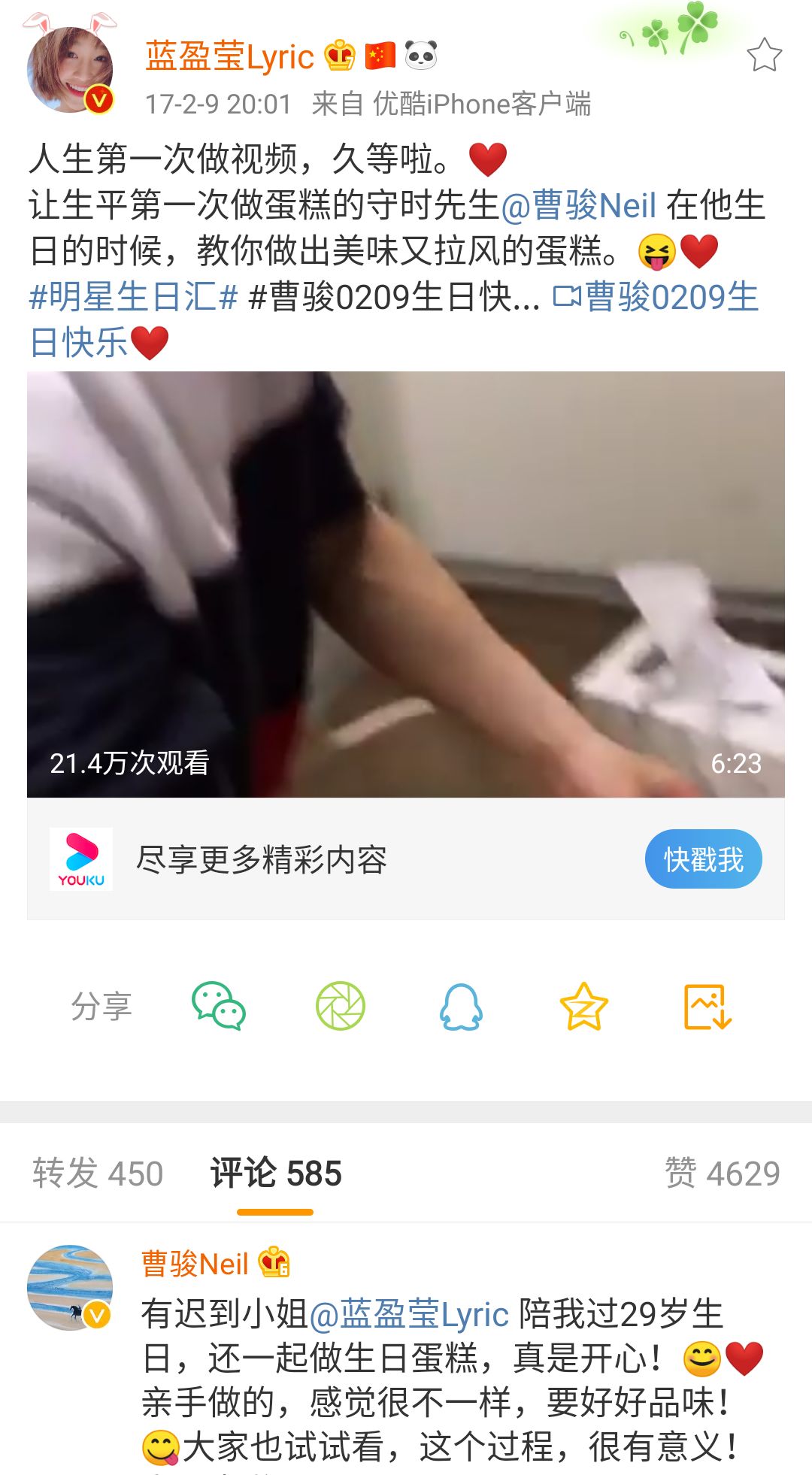 反之曹骏的生日当天,蓝盈莹则亲自做蛋糕为他庆生,还制作了视频作为留念。