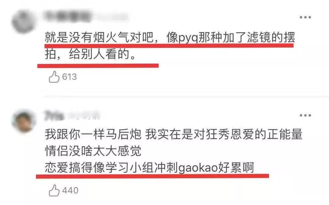 还有一种观点认为,很努力地在面前营造积极上进的情侣形象,这种带了“滤镜”的恋情,其实缺少烟火气,整得像考前冲刺一样,压力太大了,久而久之就会使不上劲。